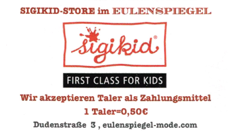 - Spenden Sie unseren Taler für einen guten Zweck. Wir tauschen die Taler in Euro um und überweisen das Geld (pro Taler 1,- Euro) an eine wohltätige Organisation in unserer Region.
